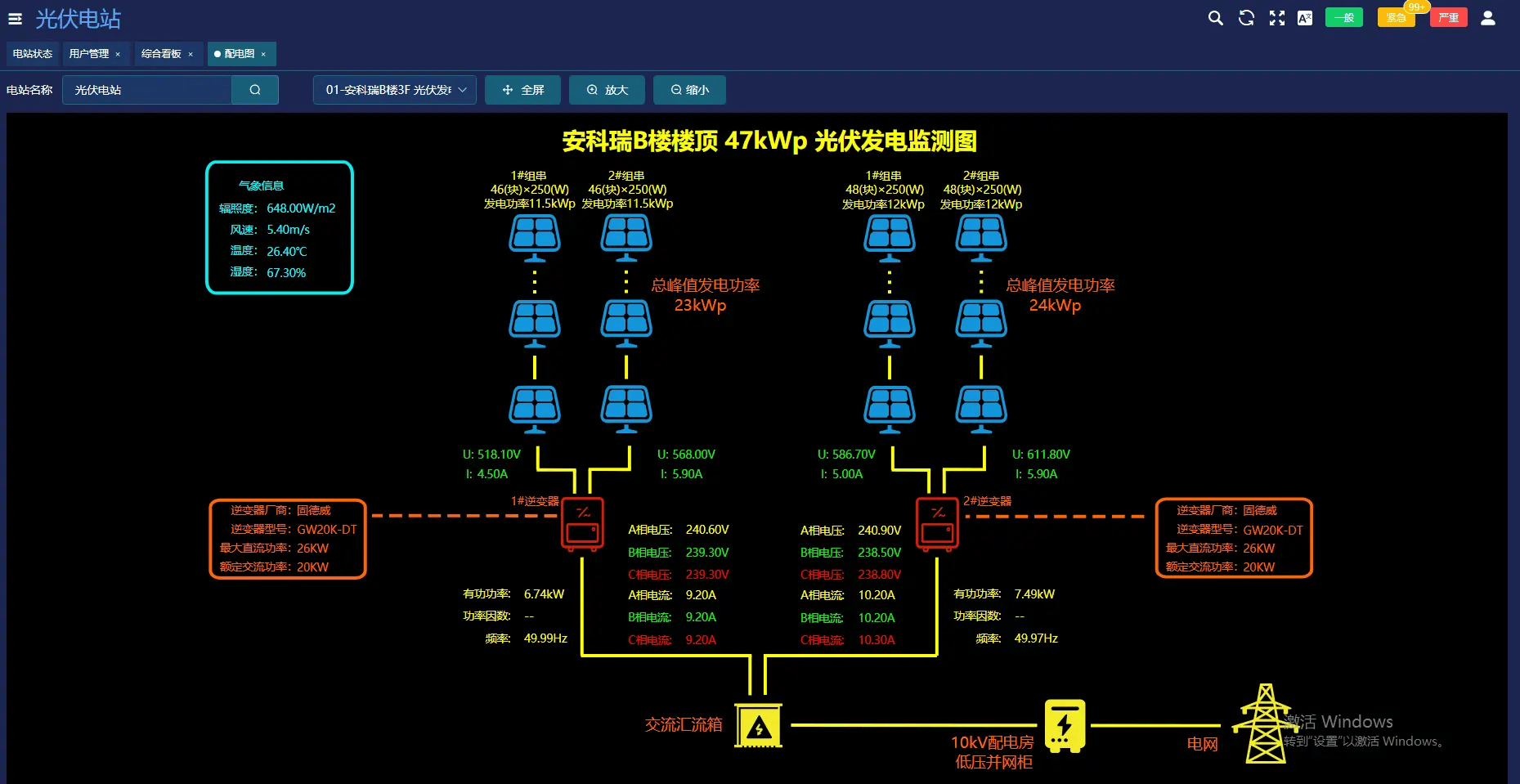 提供发电功率监测、装机容量记录、发电量统计、光伏收益计算等功能。同时,还能计算二氧化碳减排量和节约吨标煤量,以直观的数据和图表形式呈现给用户,让企业清晰了解光伏电站的运行效益和环保贡献。通过综合看板,企业管理人员可以快速掌握电站的整体运行状况,为决策提供数据支持。