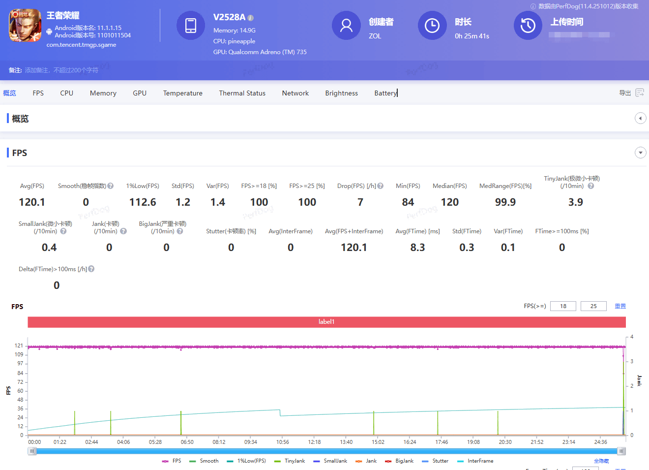 在《王者荣耀》开启高画质的情况下,S50在半小时的游戏过程中,平均帧率达到120.1帧,整体表现相当稳定。在测试全程中,S50没有出现明显的卡顿或发热降频现象。4200mm²的超大VC液冷均热板功不可没,它能有效覆盖核心热源,保证手机在长时间高负载运行下依然冷静。
