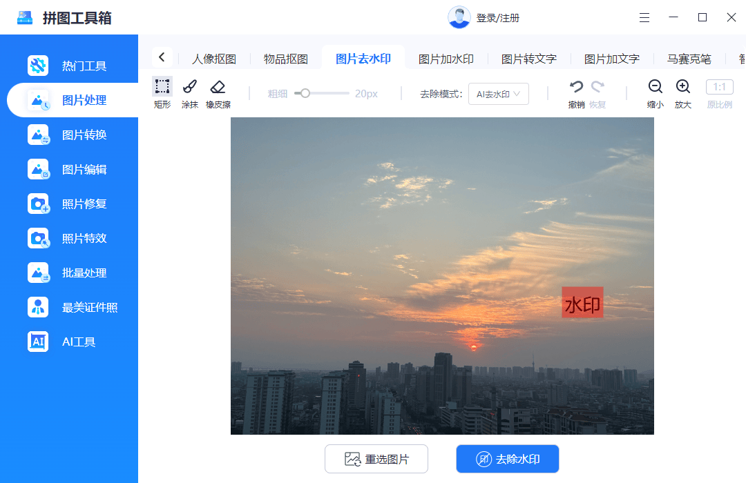 使用拼图工具箱🧰去水印也很简单,只需要导入照片,选择去水印功能,然后用软件自带的工具框选水印区域,点击“开始去除”按钮,就能自动完成去水印操作。