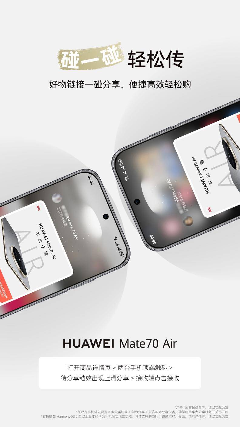 华为Mate 70 Air搭载的7英寸大屏,天生具有出众的影音娱乐体验,而当用户想与朋友组队开黑,或看到一段精彩视频希望分享时,只需借助HarmonyOS 6全新升级的“碰一碰”功能,即可实现快速组队与高效分享。若家中还配有鸿蒙生态的电脑或平板,同样可通过“碰一碰”轻松同步工作文档、照片素材等等,跨设备协作从此更简单、更无缝。