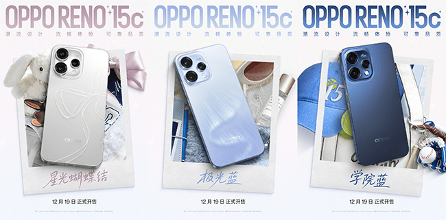 12 月 15 日,OPPO 官宣 Reno15 系列新成员——Reno15c 正式开启预约,12 月 19 日全渠道开售。