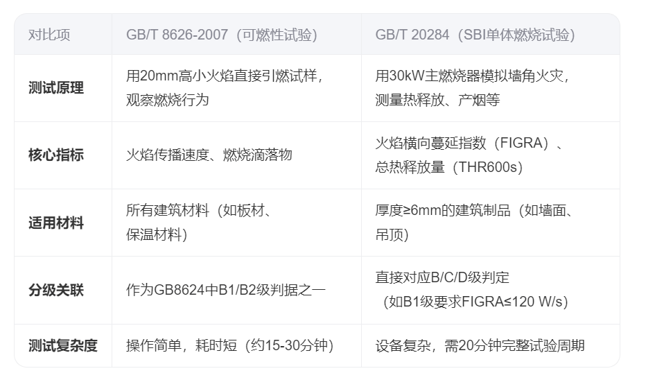 GB8626和SBI测试的核心区别在于:GB8626评估材料在小火焰下的初始燃烧特性,而SBI模拟真实火灾场景下的综合燃烧性能。具体对比如下:
