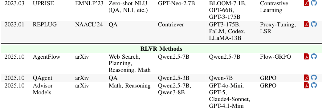 REPLUG和LLM-R等方法提出,应该利用冻结的LLM给出的反馈(如困惑度降低程度或生成的答案正确率)来训练检索器。