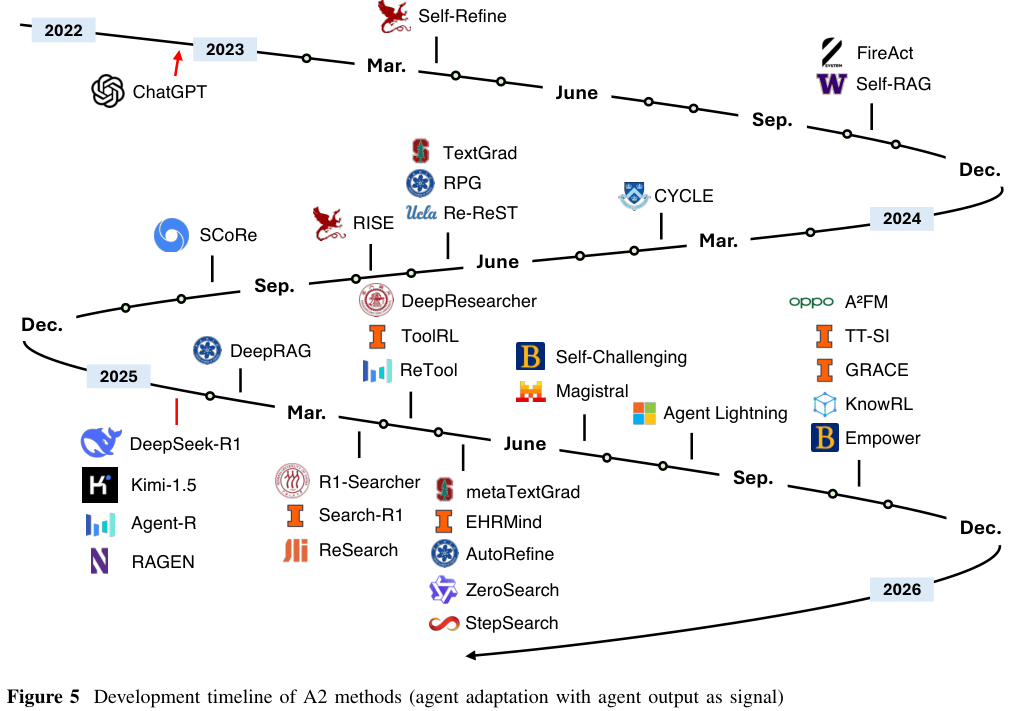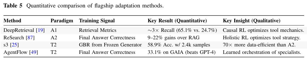 A2象限则代表了智能体输出驱动的适应。与A1关注工具执行的微观结果不同,A2关注的是最终任务的宏观成败。