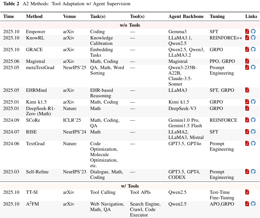 在智能体适应性的版图中,最直观的路径是直接改造智能体本身,使其更擅长使用工具或进行推理。