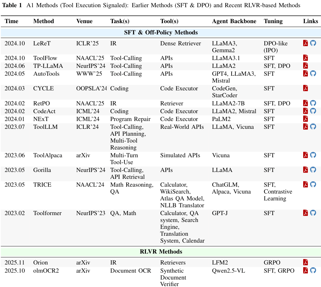 综述构建了一个包含四个象限的系统性框架,根据被优化的对象是智能体还是工具,以及优化信号是来自工具执行结果还是智能体自身的输出来划分。