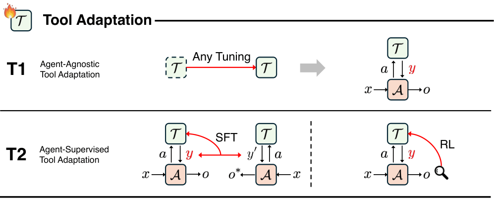 T1象限代表了与智能体无关的工具适应。这是最经典的工具开发模式。工具被独立训练,不针对任何特定的智能体,就像一把通用的锤子,谁都能拿来用。