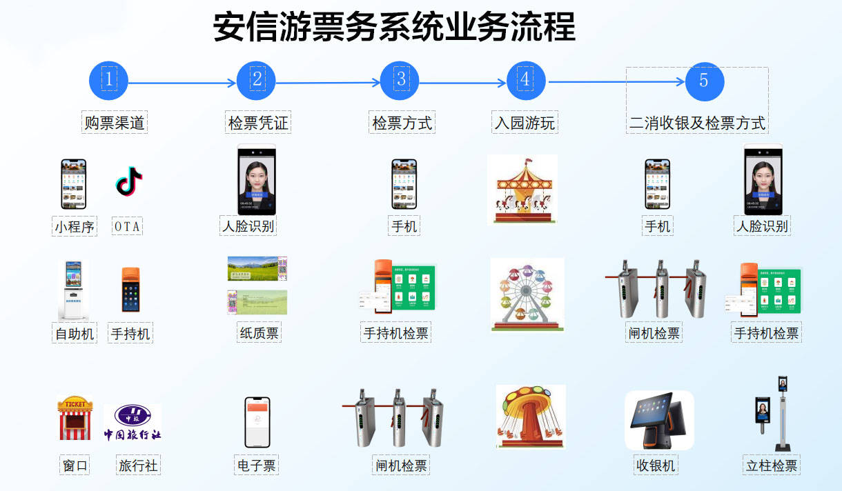 - 线下渠道:自助售票机(现场自助操作,减少人工窗口排队耗时)、手持售票机(适配景区流动售票等灵活场景)、景区人工窗口(覆盖传统现场购票需求)、合作旅行社(对接传统渠道的团体客源)。