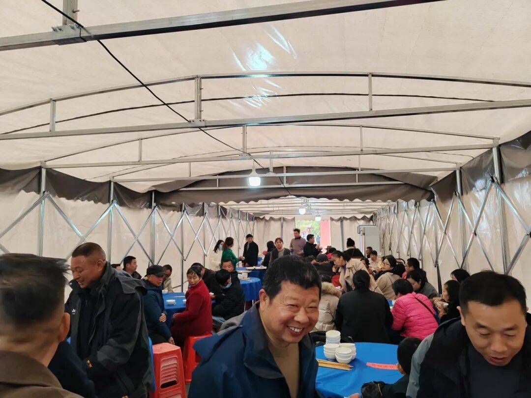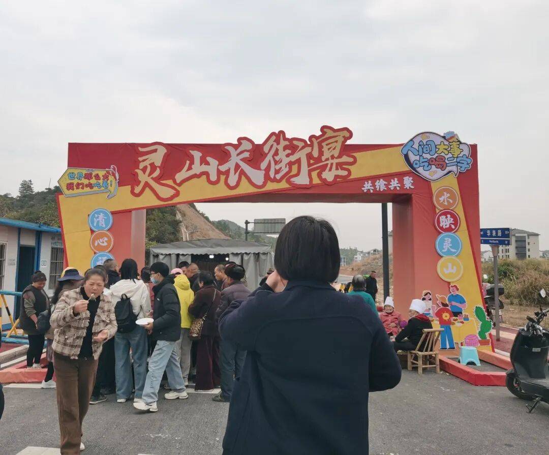 中午时分,活动迎来高潮——长街宴沿着景区街道铺开。十余张桌子依次摆开,地道的灵山土菜陆续上桌:灵山鲜鸡汤、梅菜扣肉、剁椒鱼头、手工豆腐酿……游客们围坐在一起,共享这场冬日盛宴。