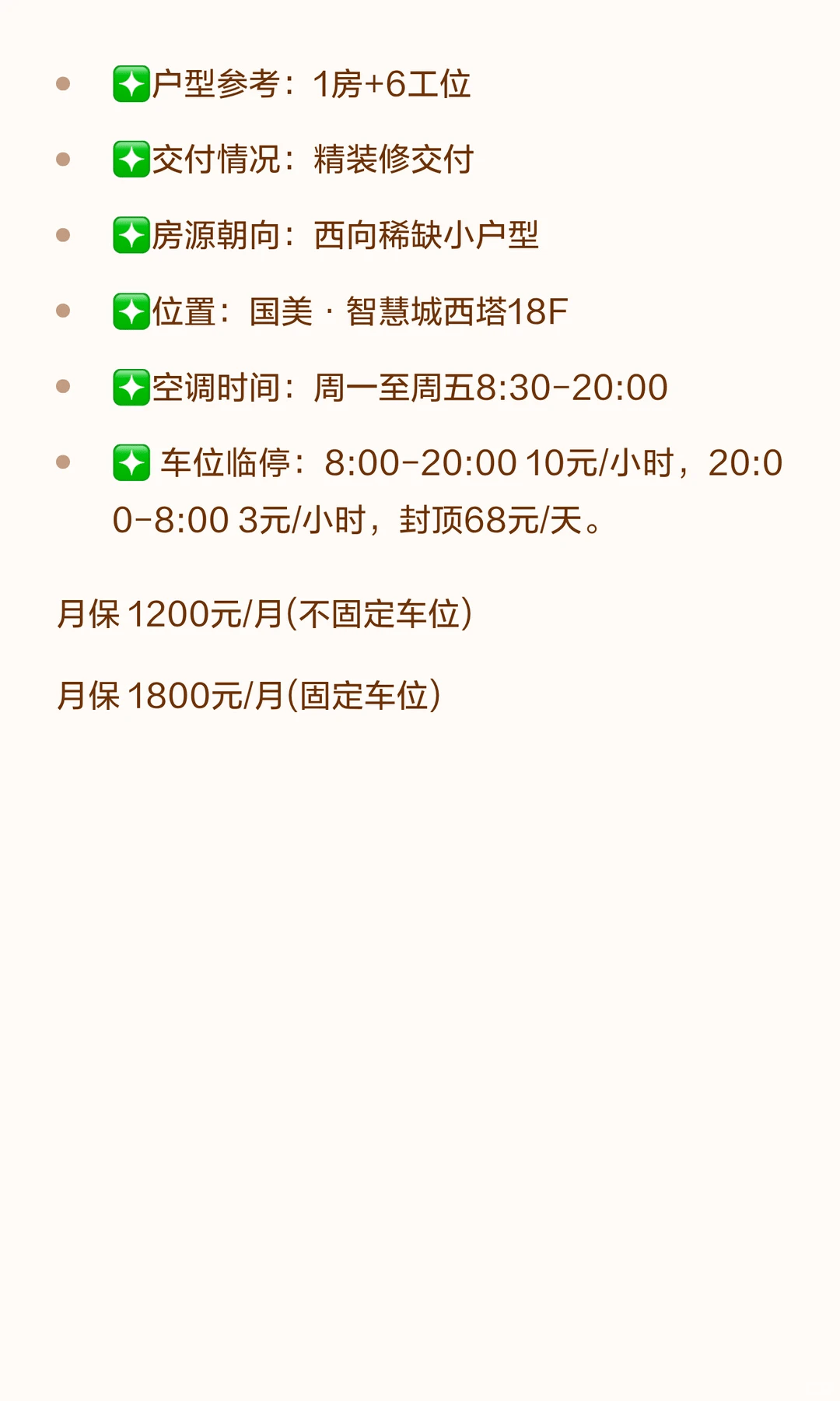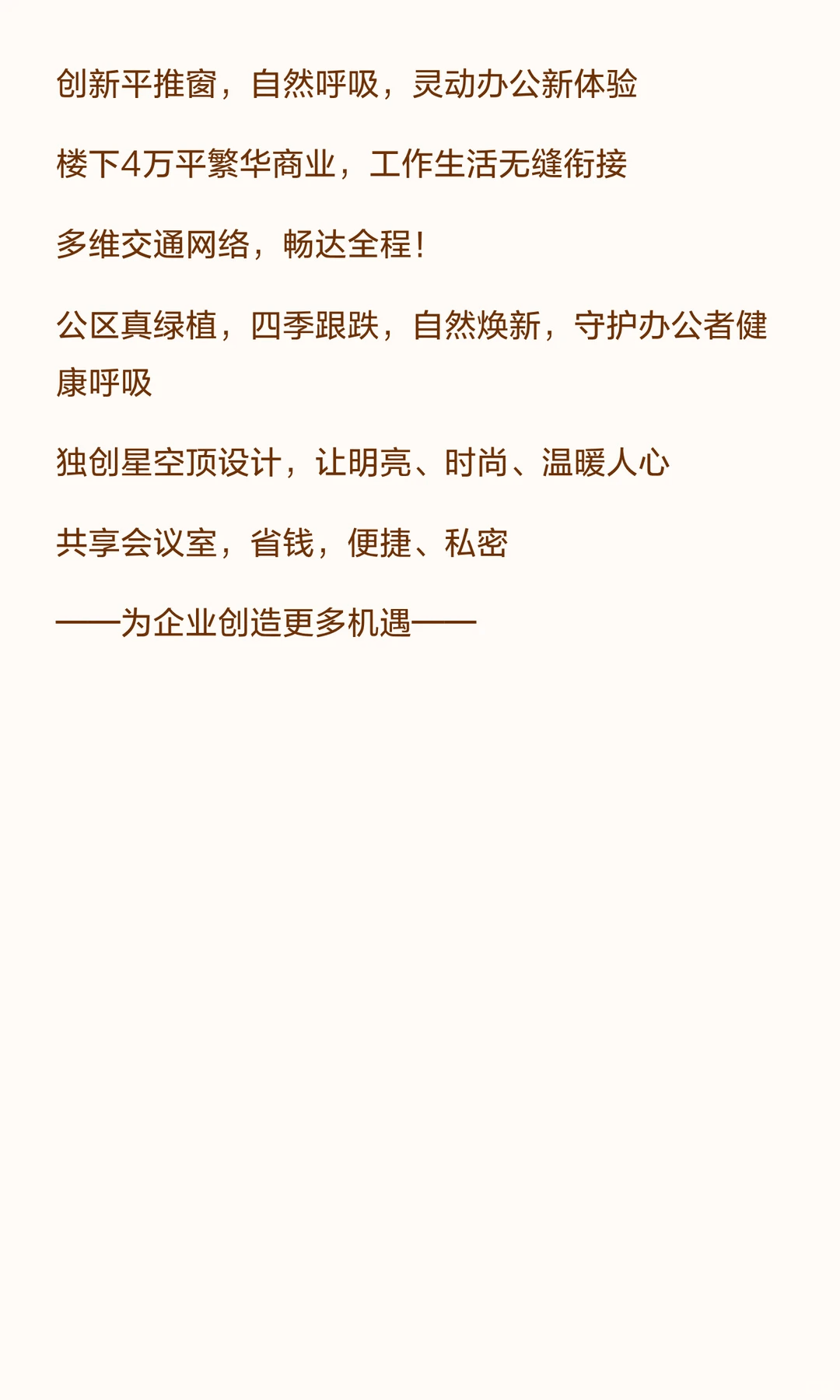 - 办公标准: 层高4.2米-4.5米,净高3米,无柱式大开间,使用率高,空间开阔。