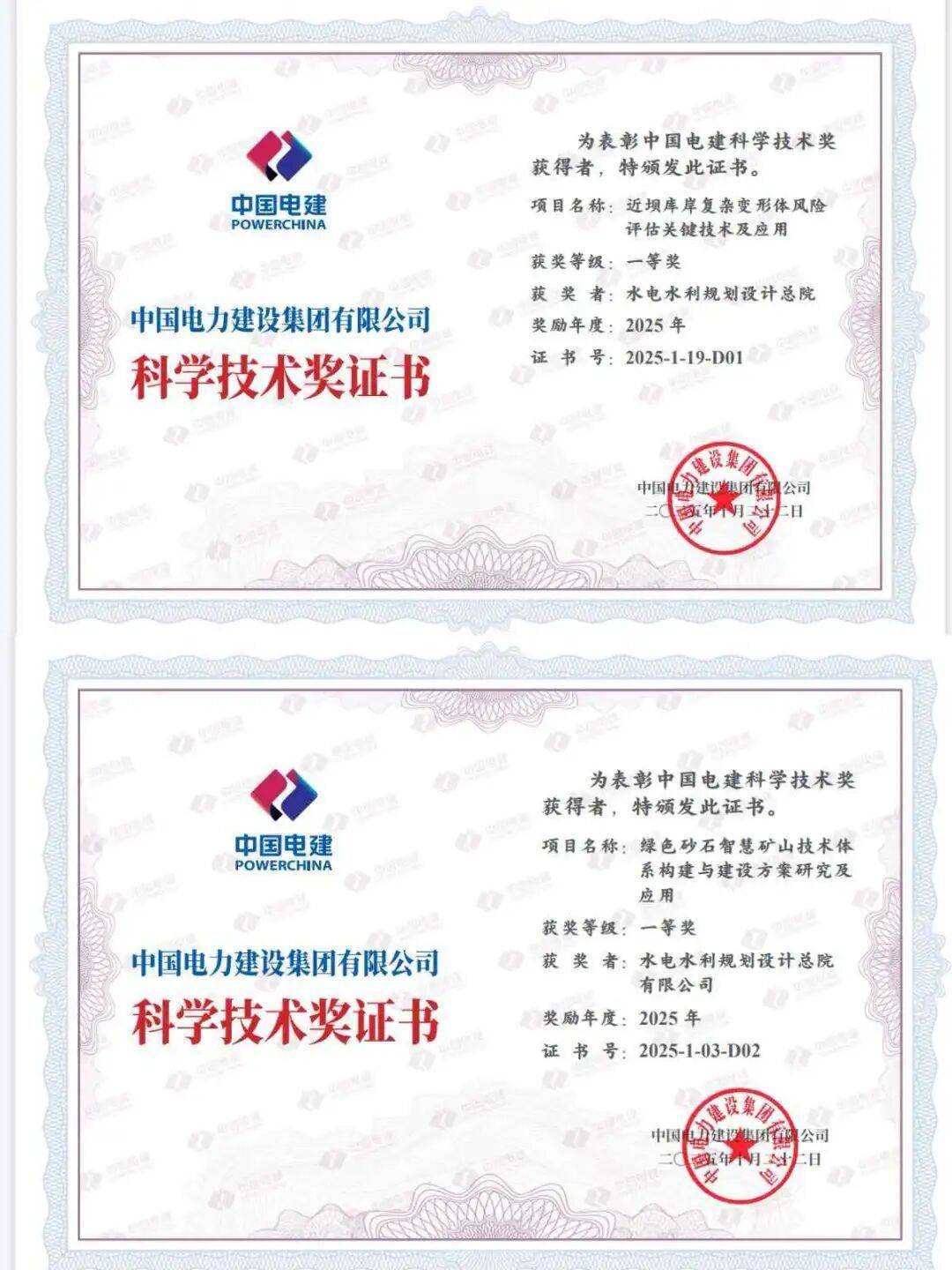 牵头的《近坝库岸复杂变形体风险评估关键技术及应用》《绿色砂石智慧矿山技术体系构建与建设方案研究及应用》等2个项目获得中国电建科学技术奖一等奖,并牵头另获二等奖3项、三等奖2项,参与获奖2项;牵头的《基于新型电力系统建设的全国抽水蓄能中长期发展需求研究》获2025 年度水力发电科学技术一等奖,并牵头另获二、三等奖各1项;《高土石坝漫顶溃坝致灾过程模拟理论方法及应用 》《严寒地区抽水蓄能电站设计关键技术与应用》《西北地区水风光储一体化高效开发利用关键技术及应用》等3个项目获中国大坝工程学会科技进步奖一等奖;《高面板坝坝面变形防控技术与体系创建及应用》《流域梯级开发重要水生生态功能协同保护与持续提升关键技术》等两个项目获电力工程科学技术进步奖一等奖;《基于水电站工程储能工厂建设关键技术》获工程建设科学技术进步奖二等奖。
