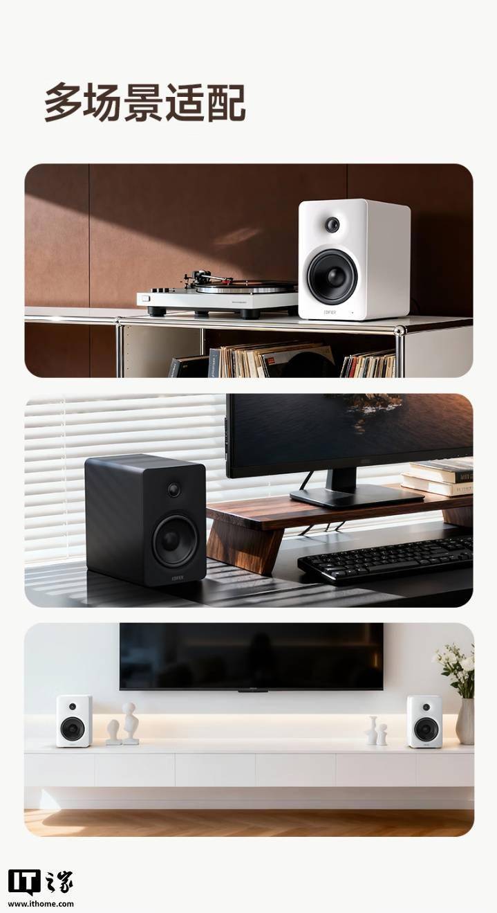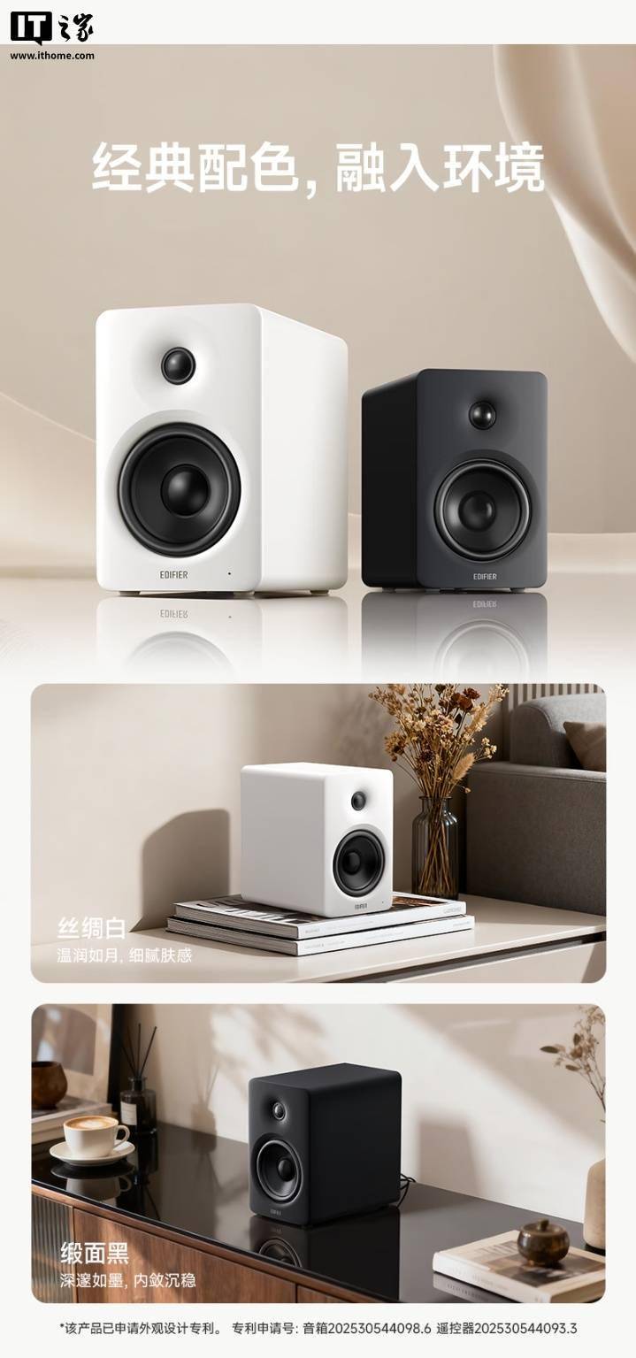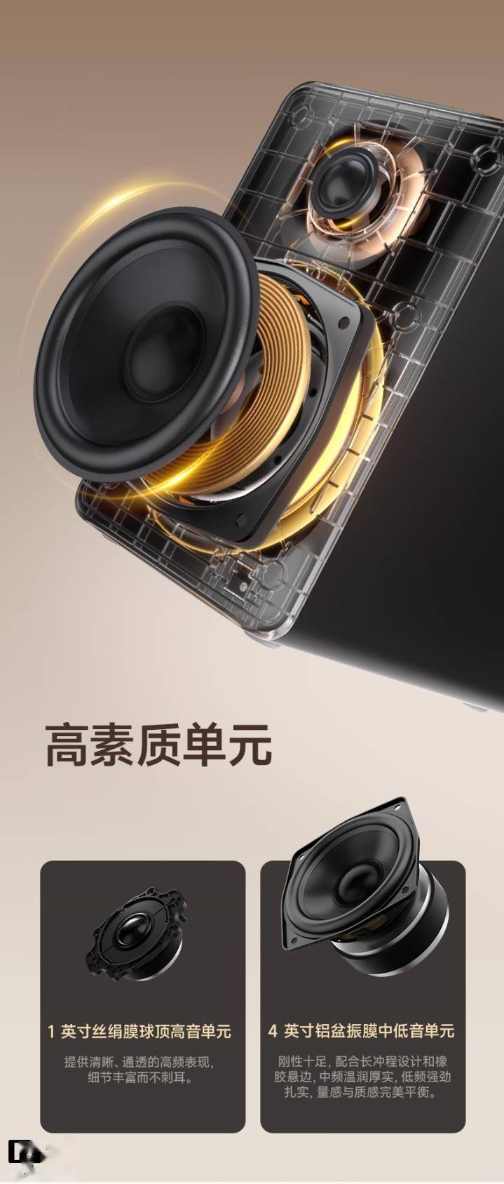 据介绍,这款音箱有丝绸白、缎面黑两种配色可选,内置 4 英寸铝盆振膜重低音单元和 1 英寸丝绢膜球顶高音单元,可提供较高声学素质,自带双数字功放独立驱动,最高功率可达 100W,搭载德州仪器 TAS6822+TAS5805 『芯片』,信噪比可达 107dB(A)。