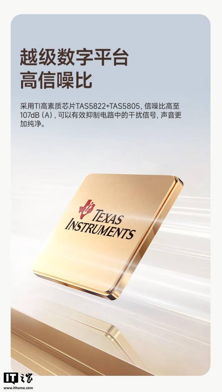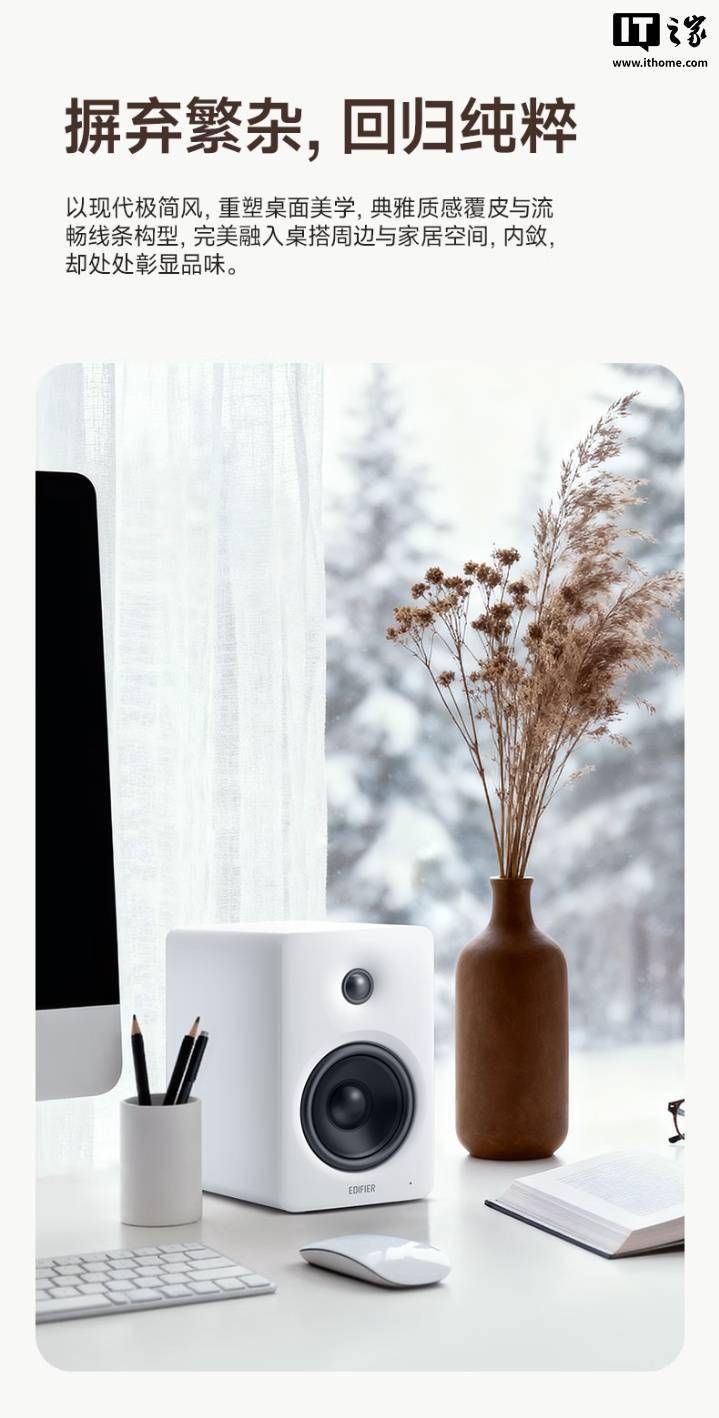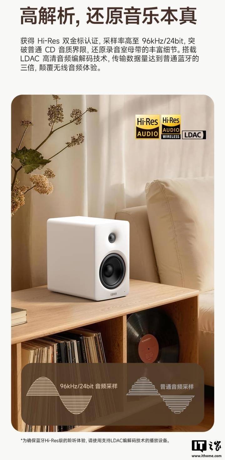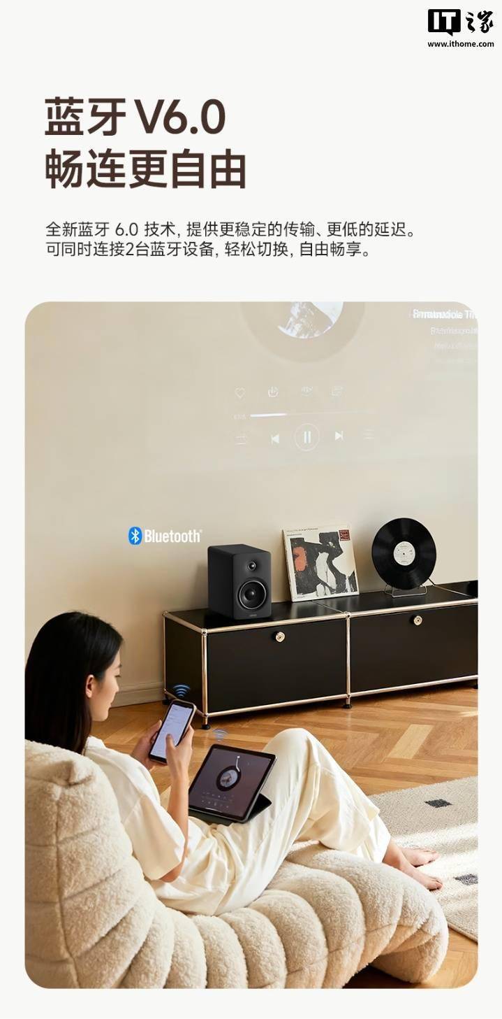 据介绍,这款音箱有丝绸白、缎面黑两种配色可选,内置 4 英寸铝盆振膜重低音单元和 1 英寸丝绢膜球顶高音单元,可提供较高声学素质,自带双数字功放独立驱动,最高功率可达 100W,搭载德州仪器 TAS6822+TAS5805 『芯片』,信噪比可达 107dB(A)。