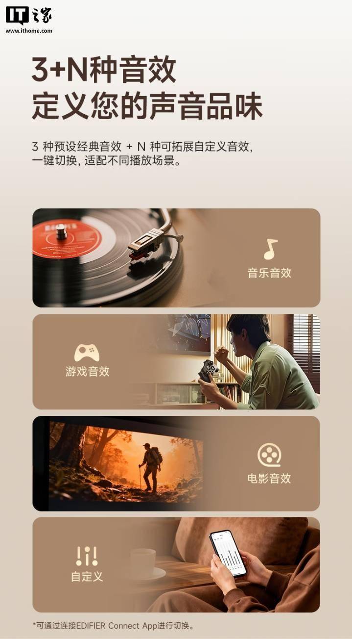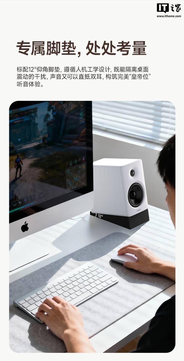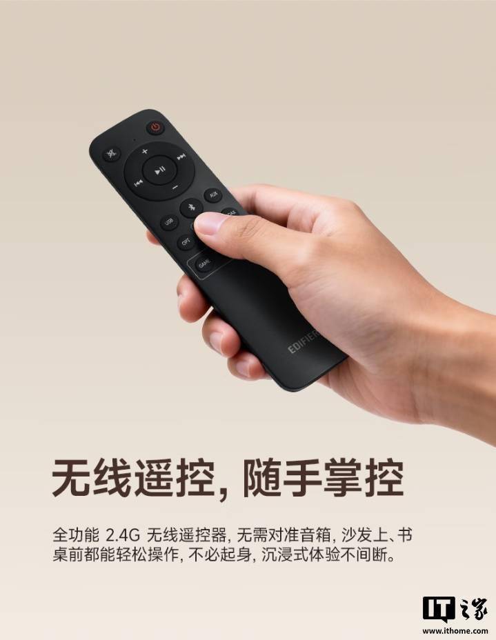 此外,这款音箱还带有全功能 2.4G 无线🛜遥控器,不需要对准音箱就能进行操作,支持 EDIFIER Connect App,可进行 EQ 调节、音源切换、定时关机、固件升级等操作,标配 12° 仰角脚垫,可隔离桌面震动干扰。