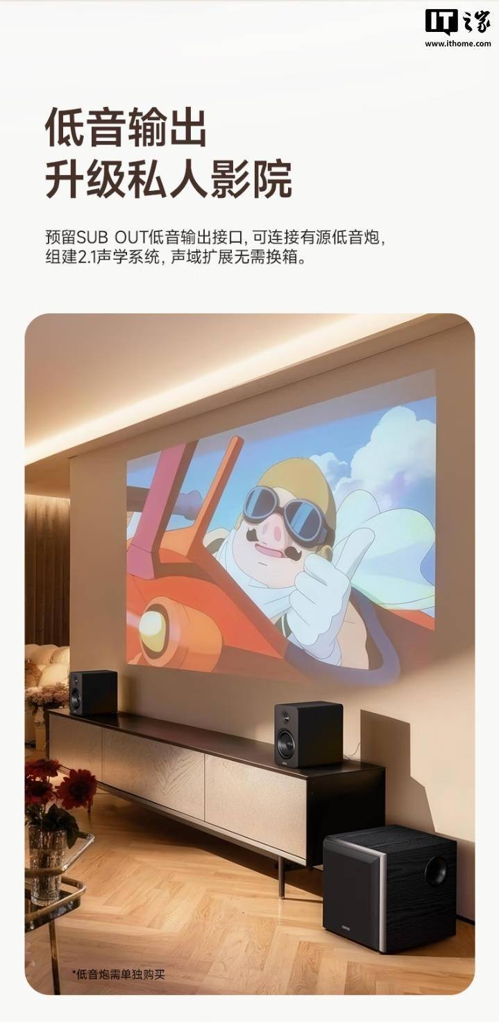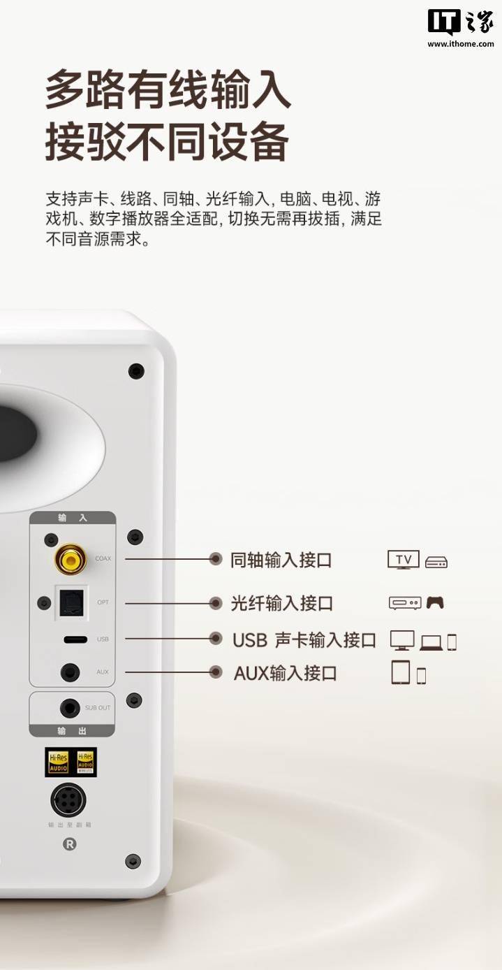 参数方面,这款音箱的频响范围是 50Hz-40kHz,通过 Hi-Res 金标认证,采样率可达 96kHz/24bit,支持全新蓝牙 6.0 技术,拥有 LDAC 编码器,支持同轴、光纤、3.5mm、USB 等输入方式,预留 SUB OUT 低音输出接口,可连接有源低音炮,组建 2.1 音箱系统。