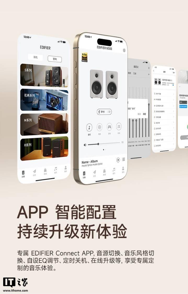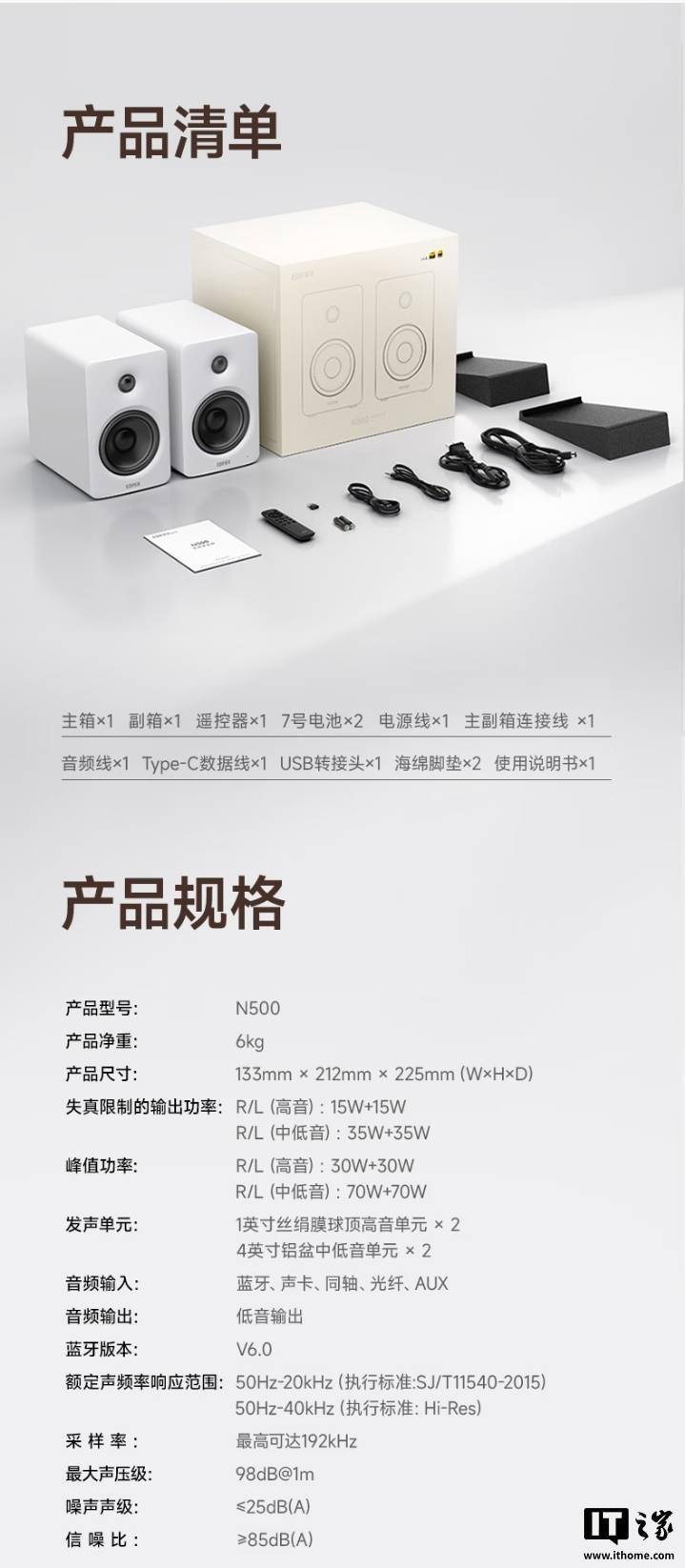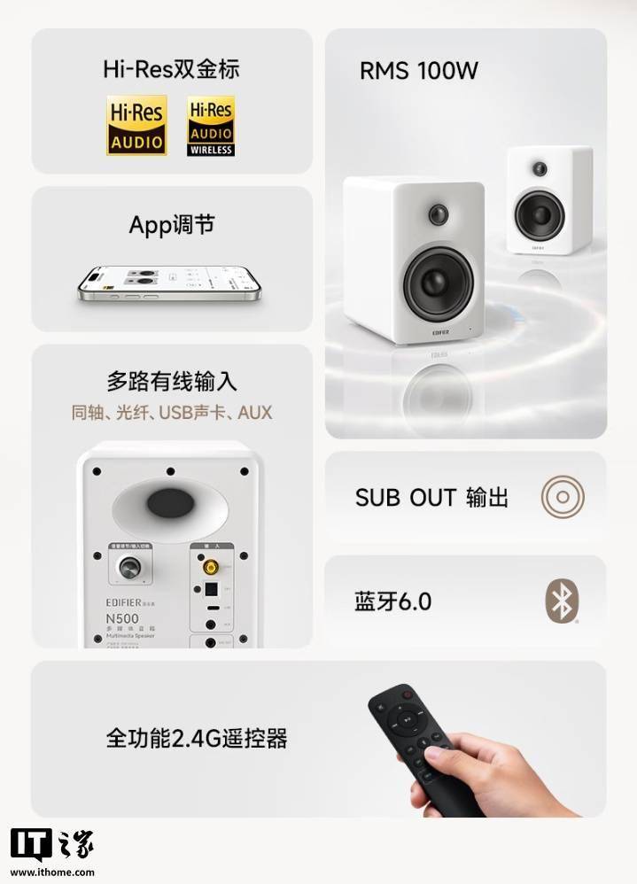 12 月 15 日消息,漫步者 N500 桌面音箱现已开售,额定功率可达 100W,支持 USB-C、蓝牙、AUX、光纤等音频输入,采用现代极简设计,售价 999 元。