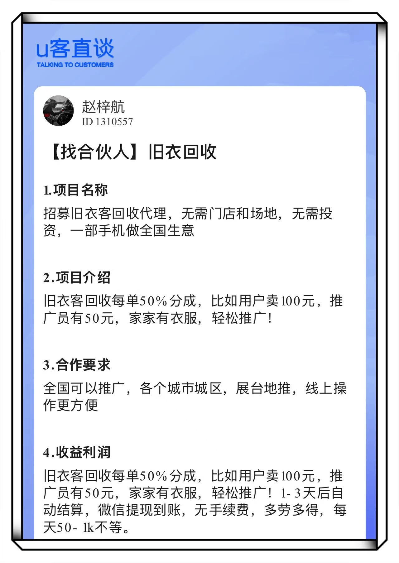 而且,现在要讲的不是走街串巷地去回收,而是推广旧衣回收小程序,完全不用觉得丢面子。根据U客直谈相关项目信息可以了解到,通过地推或网推的方式去宣传旧衣回收小程序,然后引导别人使用下单,就能获得50%左右的回收价分成。