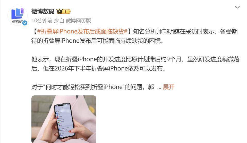 知名分析师郭明錤最新指出,苹果首款折叠屏iPhone的开发进度比原计划滞后约9个月,但仍在努力争取2026年下半年发布。不过,受制于量产爬坡的挑战,这款备受期待的产品可能面临“发布即缺货”的困境,供需平衡可能要等到2027年才能实现。
