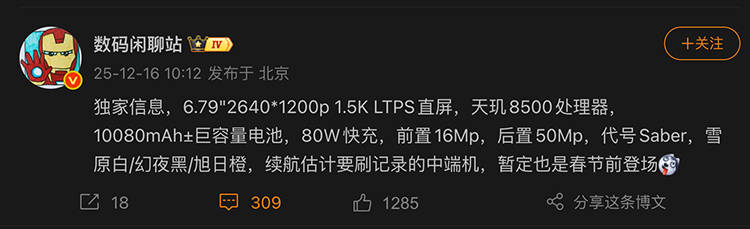 除了搭载能打败充电宝的10080mAh大电池外,它还将搭载6.79英寸1.5K LTPS直屏,分辨率为2640×1200。处理器方面搭载的是天玑8500,将支持80W快充。影像上,它将配备前置16MP、后置50MP摄像头组合。从处理器就可以看出,它的定位是在中端机,被视为荣耀Power 2。