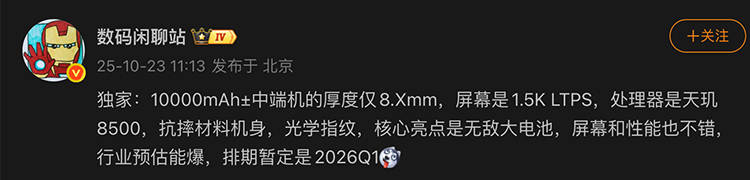 此前博主还透露过,这个手机的电池额定能量37.37Wh,额定容量9886mAh,典型值会突破10000mAh。厚度在8~9mm之间,还拥有抗摔材料机身、光学屏幕指纹,行业预估“能爆”。