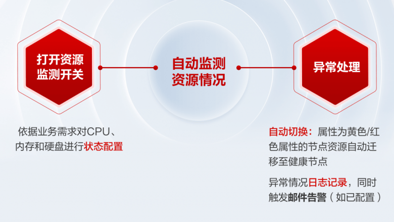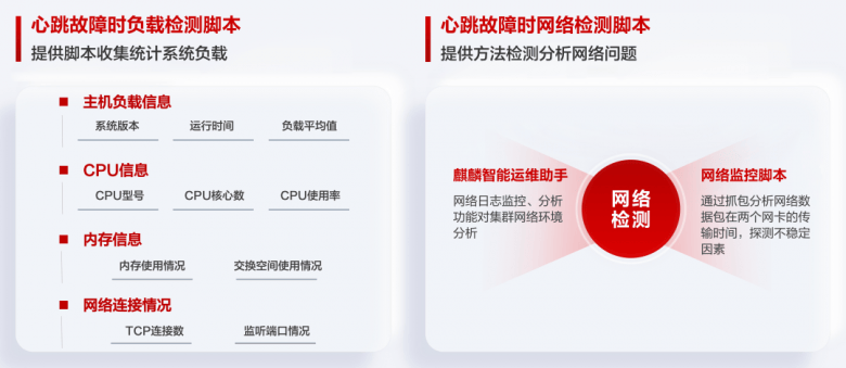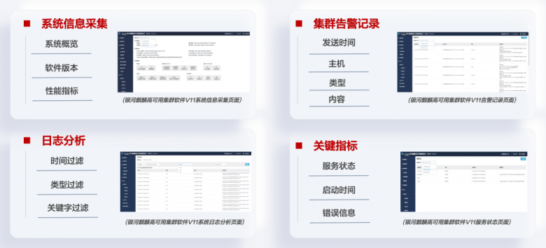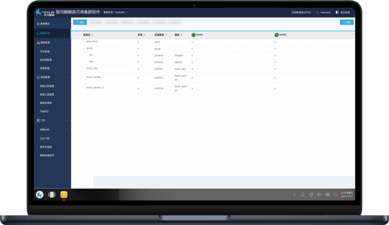 银河麒麟高可用集群软件V11以容错抗灾、智能稳定为立足点,配备自研高可用集群管理端WEB界面,实现便捷交互,搭建覆盖多集群资源与节点的监控管理、智能迁移、故障分析及报警配置等操作的全栈技术体系,同时提供双机高可用、多机高可用等多种灵活的集群援备模式,全面覆盖业务网络故障、心跳网络故障、应用故障、存储故障及节点故障等场景,实现产品故障检测时间小于10秒,故障切换及恢复秒级完成,为银河麒麟高级『服务器』操作系统提供智能高可用集群解决方案。