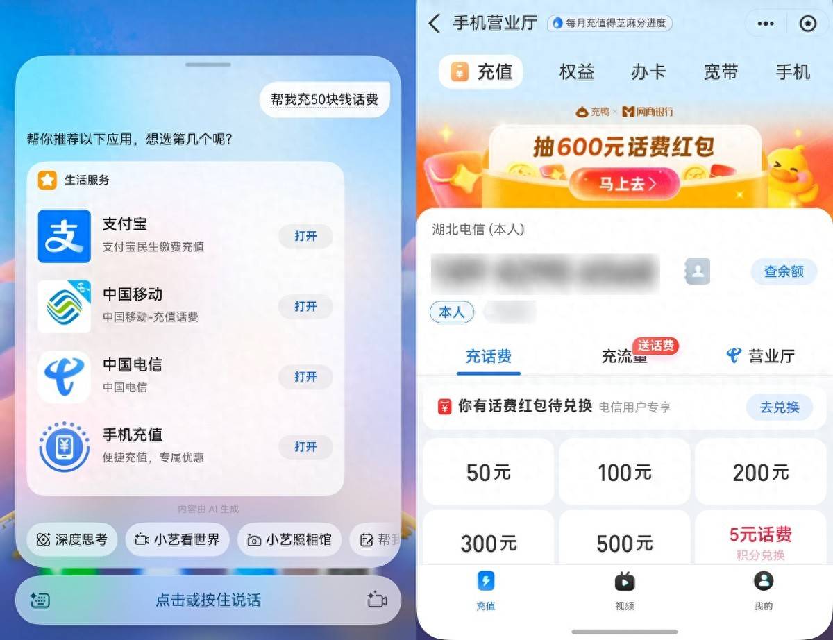 比如给手机充个话费,得先解锁手机,找到『支付宝』APP,点进去再找充值中心,输入金额,最后才能付款。这一套连招下来,熟练工也得个十几秒。但现在有了意图框架加持的小艺,体验直接降维打击。我只需要唤醒它说一句:“帮我充50块钱话费”,小艺瞬间就能调起『支付宝』的充值界面,甚至连金额都帮我填好了,只用按个指纹就能完成支付。