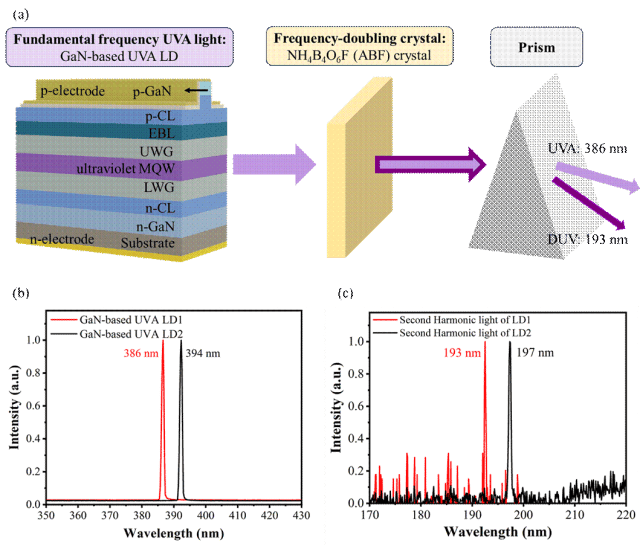 1. (a)基于GaN近紫外激光器和ABF深紫外非线性晶体的直接倍频技术原理,(b)基频光源光谱:GaN基386nm和394nm『半导体』激光器,(c)直接倍频后获得的193nm、197nm深紫外激光光谱。