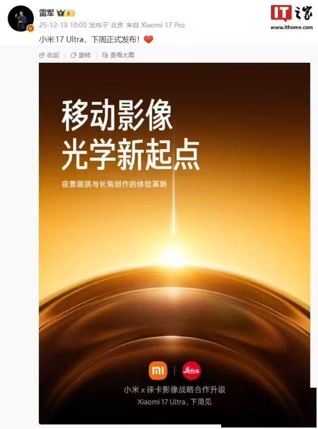 就在今天(12月18日)上午,小米创办人,董事长兼EO雷军宣布,小米17Ultra手机下周正式发布!