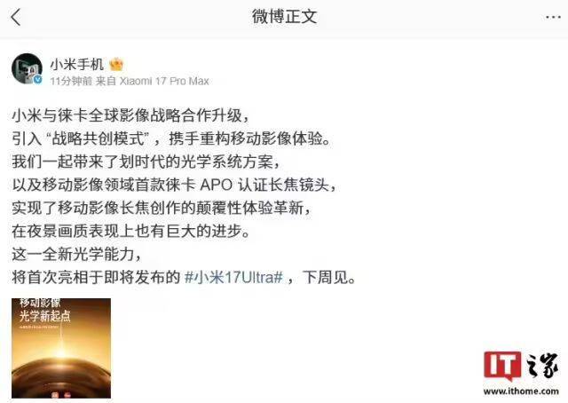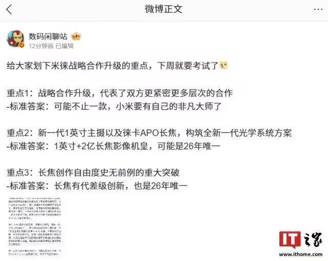 在小米 17 Ultra 官宣后,关于该机的爆料随即流出, 发现微博博主发文分享了米徕战略合作升级的重点: