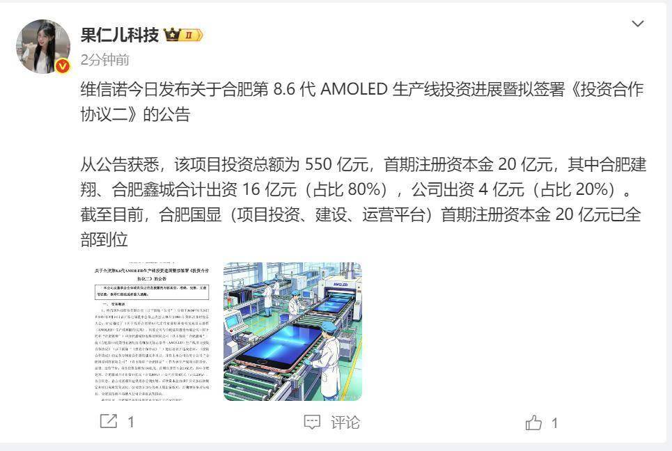 据公告披露,二期资本金中合肥建翔出资27.625亿元,合肥鑫城出资27.625亿元,维信诺出资39.18亿元。二期资本金到位后,合肥国显注册资本将增至114.43亿元。
