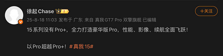 以往真我的数字系列都会推出Pro+机型,而今年真我取消了这个传统,真我副总裁徐起曾说将把15Pro打造成“豪华版Pro”,实现“以Pro超越 Pro+”。