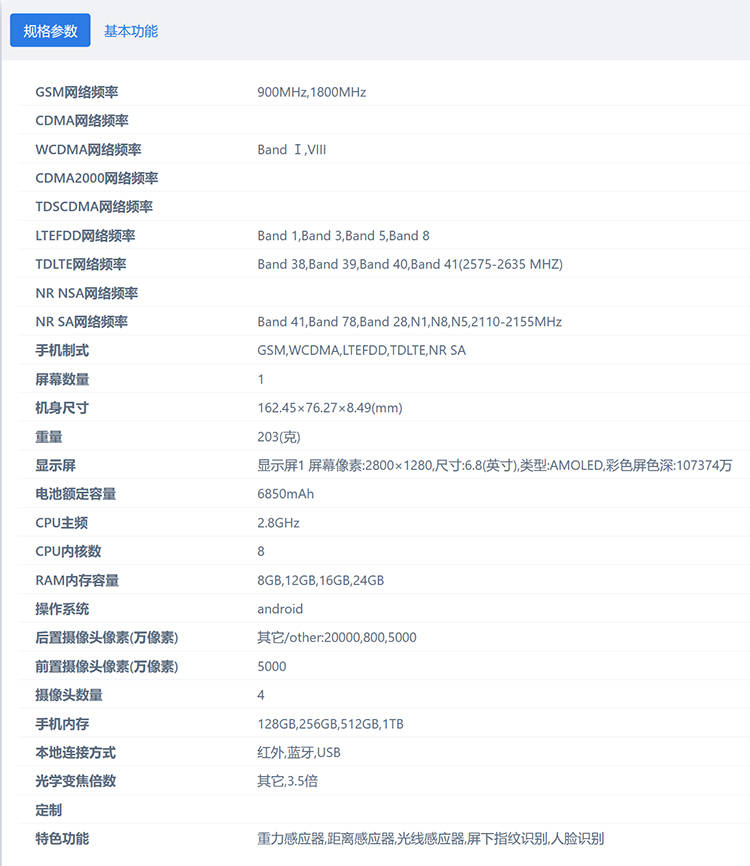 外观上,这部手机的尺寸是162.45×76.27×8.49mm,采用6.8英寸AMOLED屏,分辨率为2800×1280,支持10.7亿色显示,整机重量约203克。