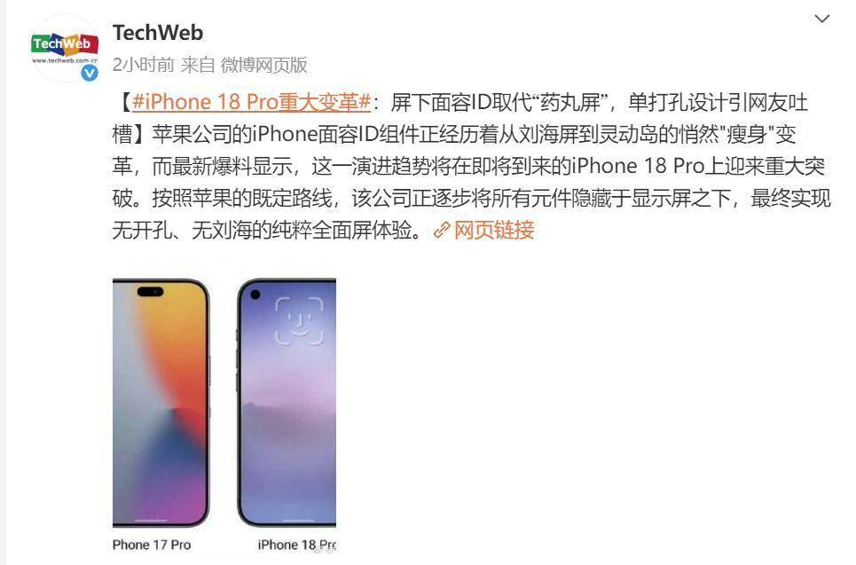 据悉,iPhone 18 Pro和iPhone 18 Pro Max将采用屏幕左上角单打孔方案,用于安置前置摄像头,而面容ID组件将移至屏幕下方。这一设计变动在网络上引发热议,不少网友对挖孔位置设在左上角而非居中提出质疑 。