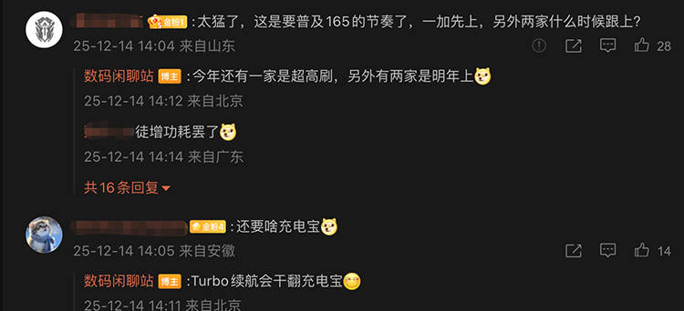 在评论区中,有粉丝提到165Hz刷新率要普及了,博主的回复表示肯定,并且还提到明年也有两家将来到这个超高刷档位。而另一个评论里博主还表示,Turbo的续航将干翻充电宝。
