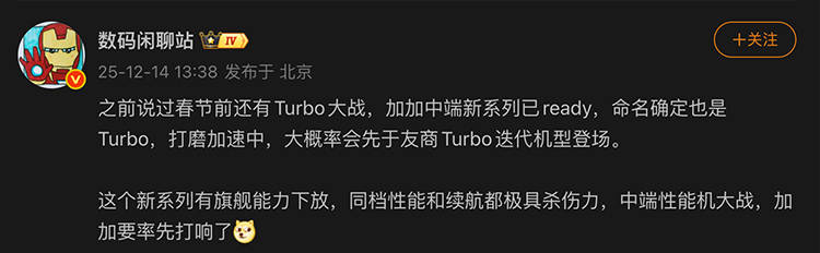 正好昨天,博主 @ 数码闲聊站 也对一加 Turbo 系列进行爆料,一加正在加速打磨这个手机,所以大概率是第一个冲刺的厂商。而且,新系列将会获得旗舰下放能力,在同档位下性能和续航都很有杀伤力。