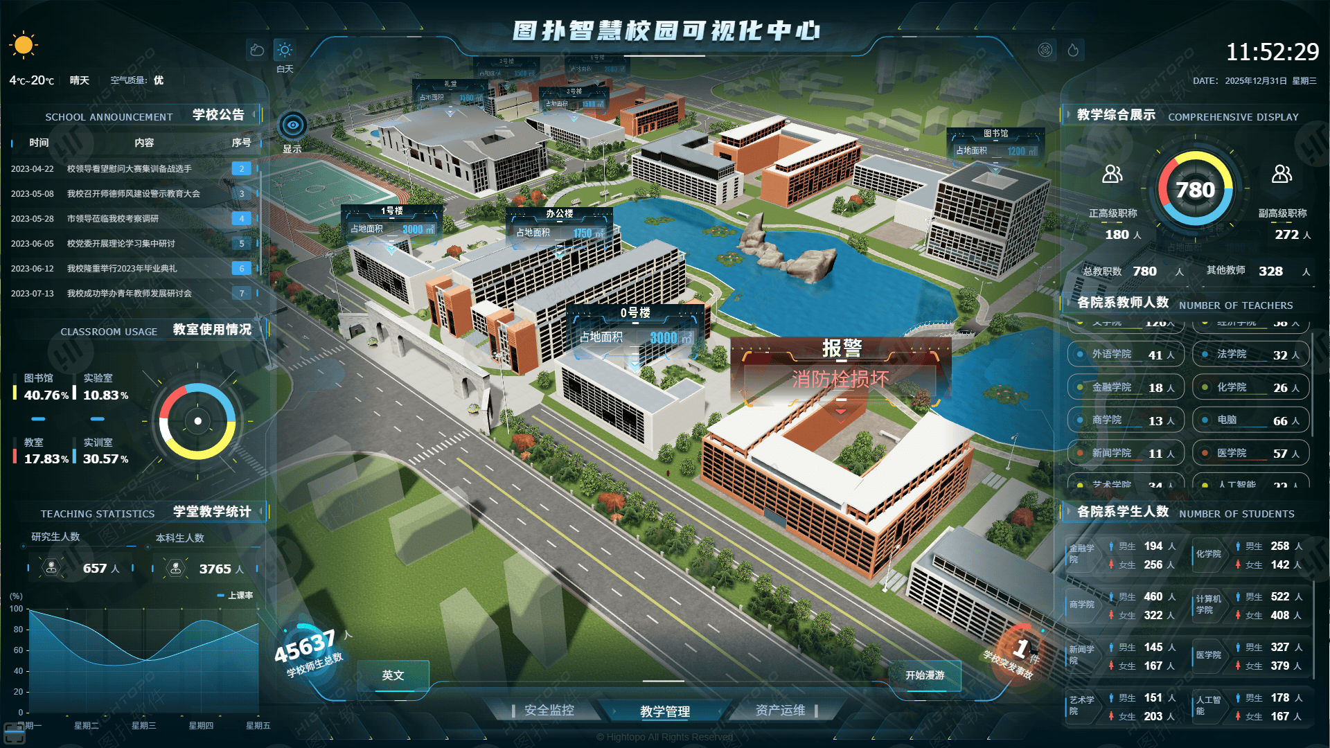 传统校园管理中,教学、资产、能耗等数据分散在不同系统,而数字孪生将这些数据统一接入三维场景:左侧面板展示学校公告、教室使用情况,右侧面板呈现师资、学生数据,底部则汇总资产与故障信息。管理者通过一个屏幕即可掌握校园运行的全维度数据,无需在多个系统间切换,决策效率提升。