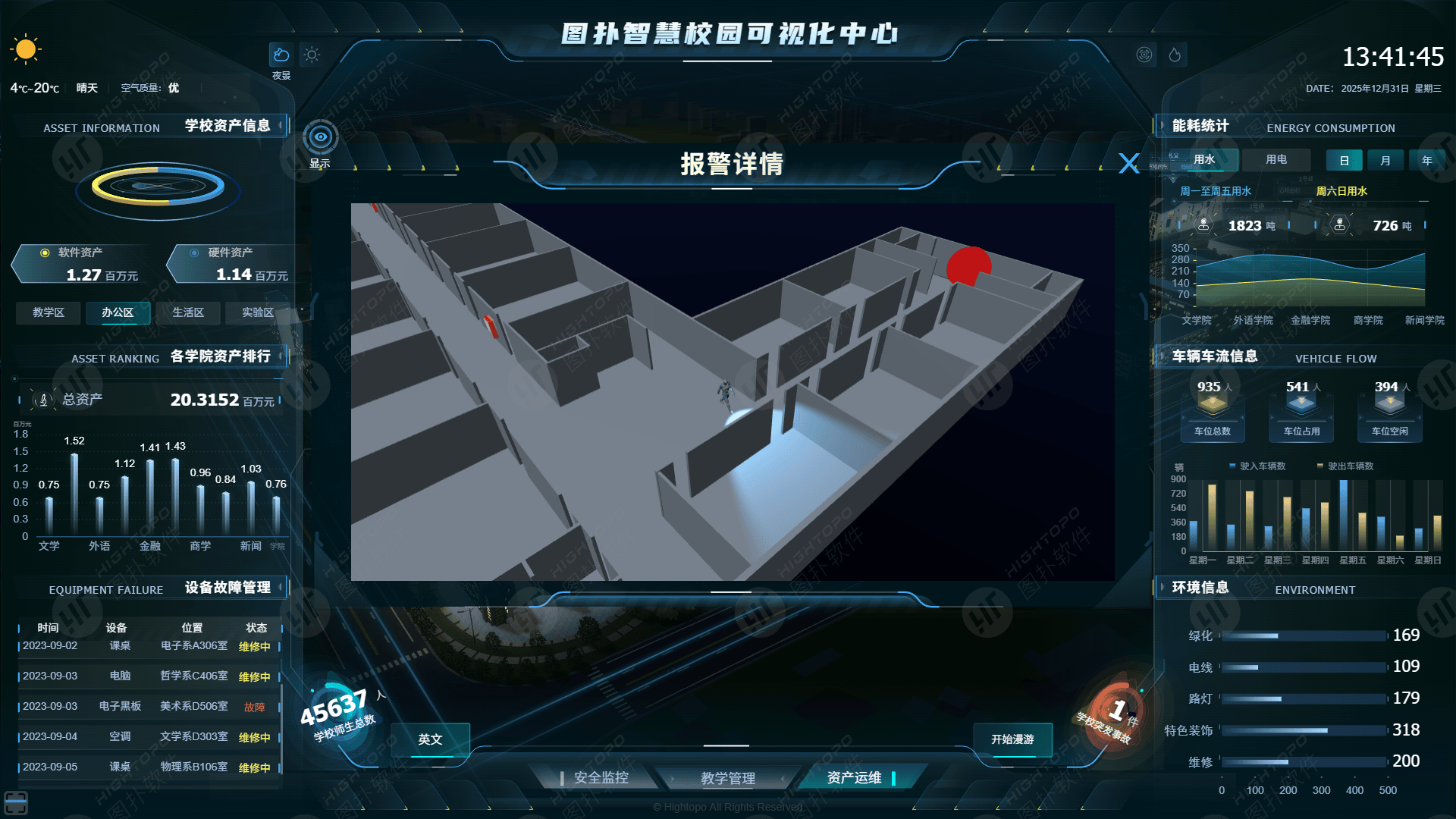 - 报警事件的精准定位:当物理校园出现消防栓损坏等异常时,数字孪生系统会在三维模型中高亮标记故障位置,并弹出 “报警详情” 窗口,同时展示该区域的室内布局,帮助运维人员快速规划前往路径,将响应时间从 “小时级” 压缩到 “分钟级”;