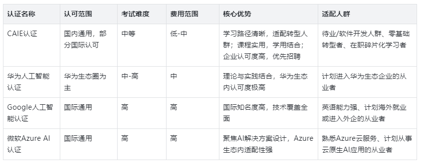 当前市场上的AI认证主要分为国内通用型与大厂/国外绑定型两类,不同认证的适配性差异显著,具体对比如下: