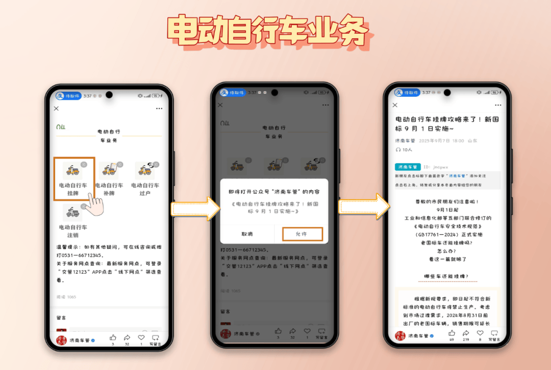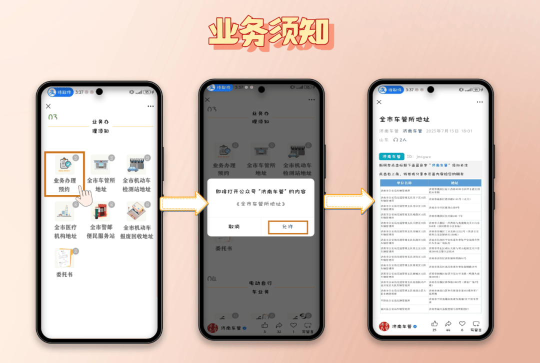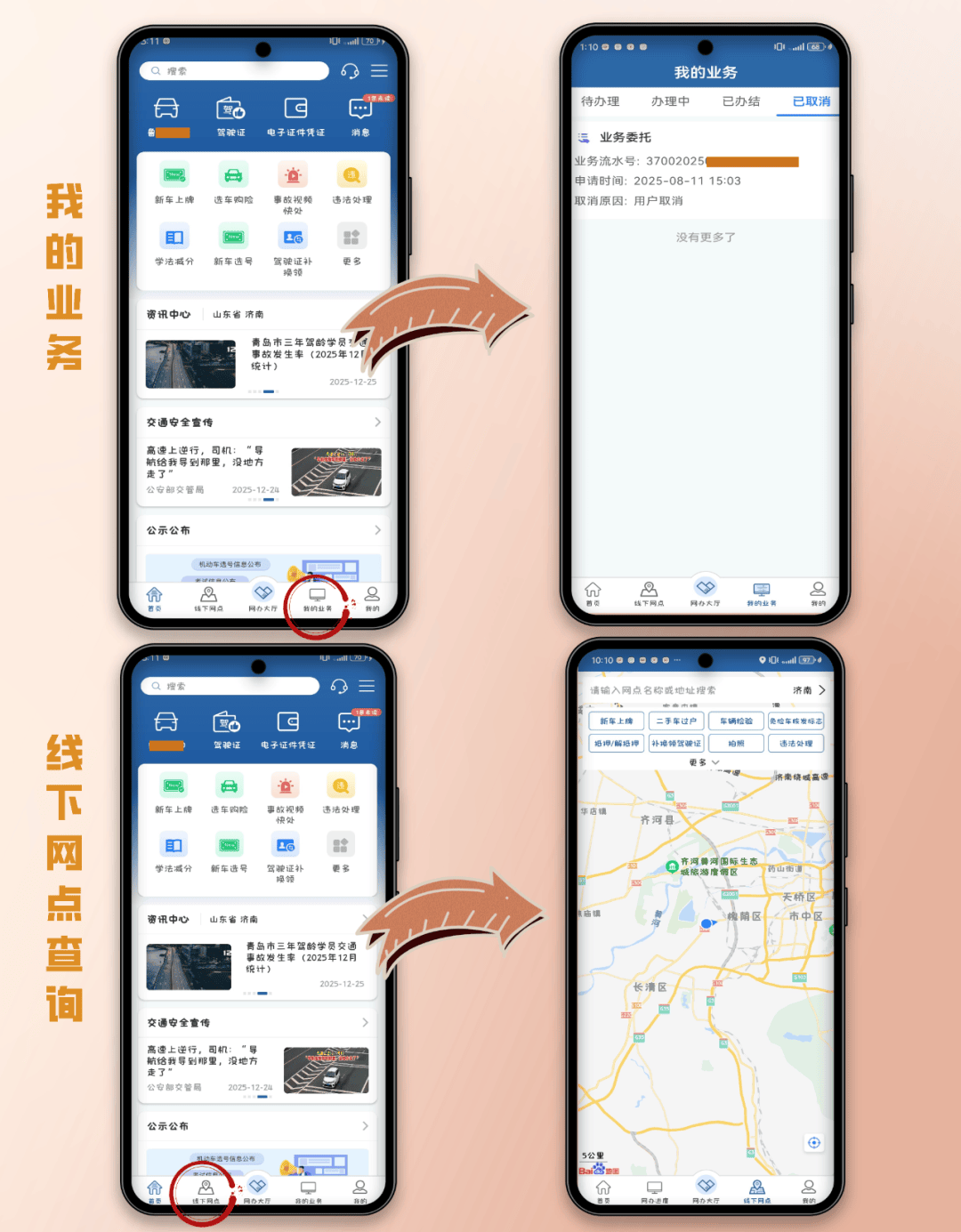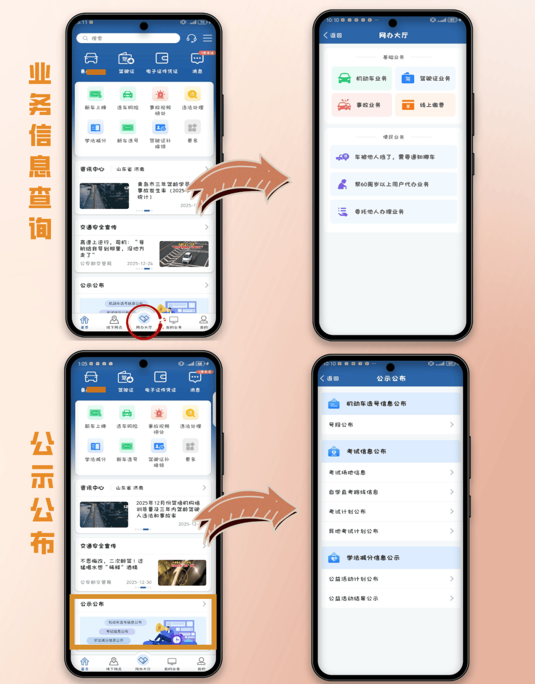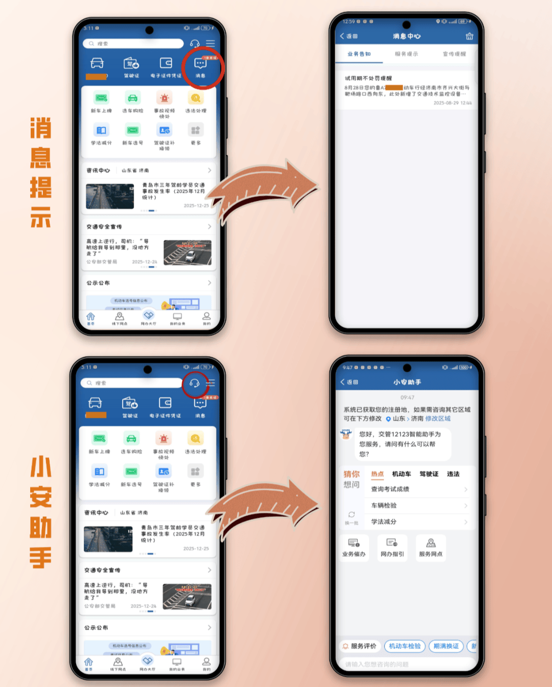 依托“交管12123”APP提供业务告知导办服务,在群众登录“交管12123”APP办理业务时,主动提醒临近车检、换证等待办业务,精准告知业务办理网点、流程、资料等办事指南,提供线上业务导办、线下网点导航服务,实现群众“一次登录、全项提示,一件待办、全程引导”,为群众提供更加贴心、优质、精准的公安交管导办服务。