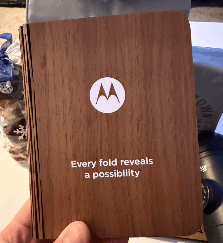 而在这份邀请函礼包中,包括了一个印有“Every fold reveals a possibility”字样以及摩托罗拉 LOGO的书,有意思的是,这本书还采用了木制活动铰链用来展开与折叠,这不免让大家联想到,是不是摩托罗拉也要推出大折叠手机了?而这款手机发布的日期,很有可能就在1月6日召开的联想科技世界活动。