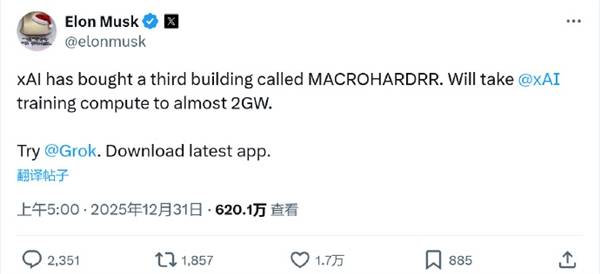 马斯克称,xAI将在其中建设『数据中心』,其拥有的AI训练负载算力也将随之扩充至2GW级别。