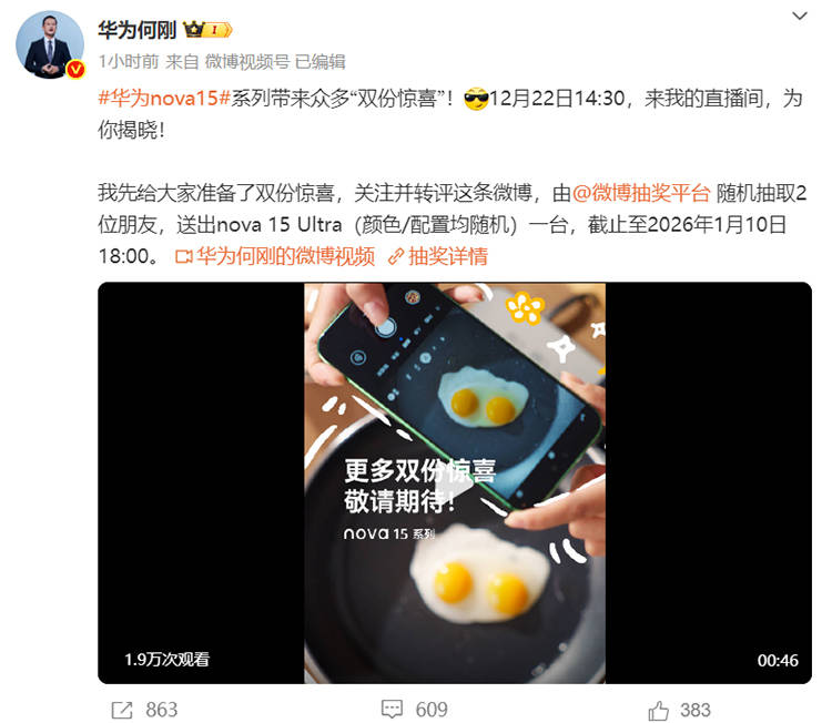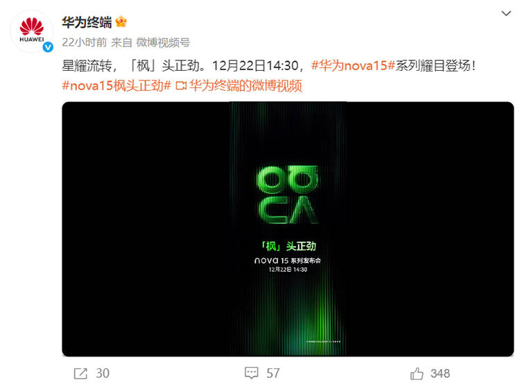 12月16日消息,此前,华为已经官宣,将于12月22日发布全新nova 15系列。就在今天,华为终端BG首席执行官何刚发布预热视频,表示nova 15系列新机将有众多“双份惊喜”。