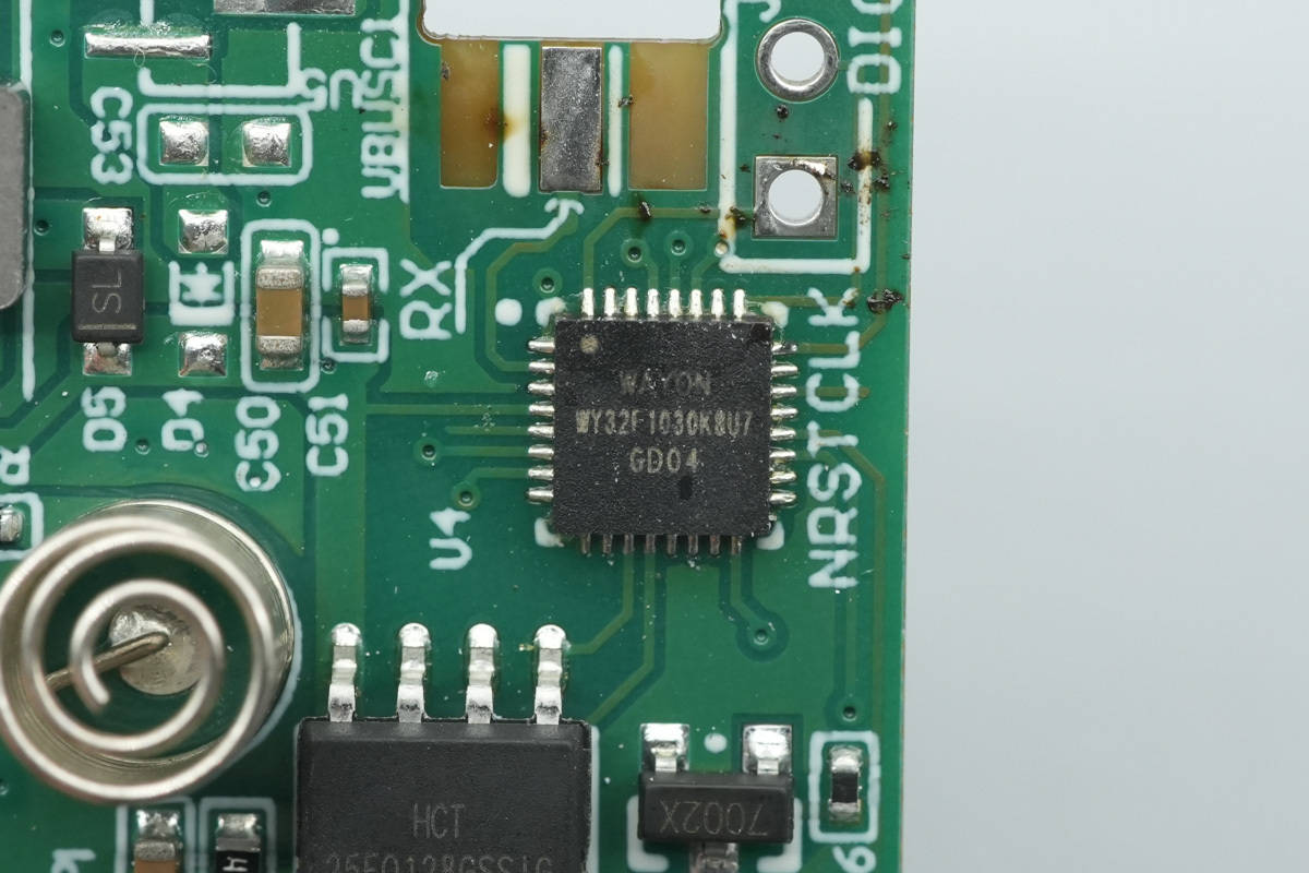 用于检测触摸操作的『芯片』来自Ronghe融和微,型号RH6016C,这是一颗内置稳压模块的单通道电容触摸感应『芯片』,内置高精度稳压,上电复位和低压复位,硬件去抖动等抗干扰措施。
