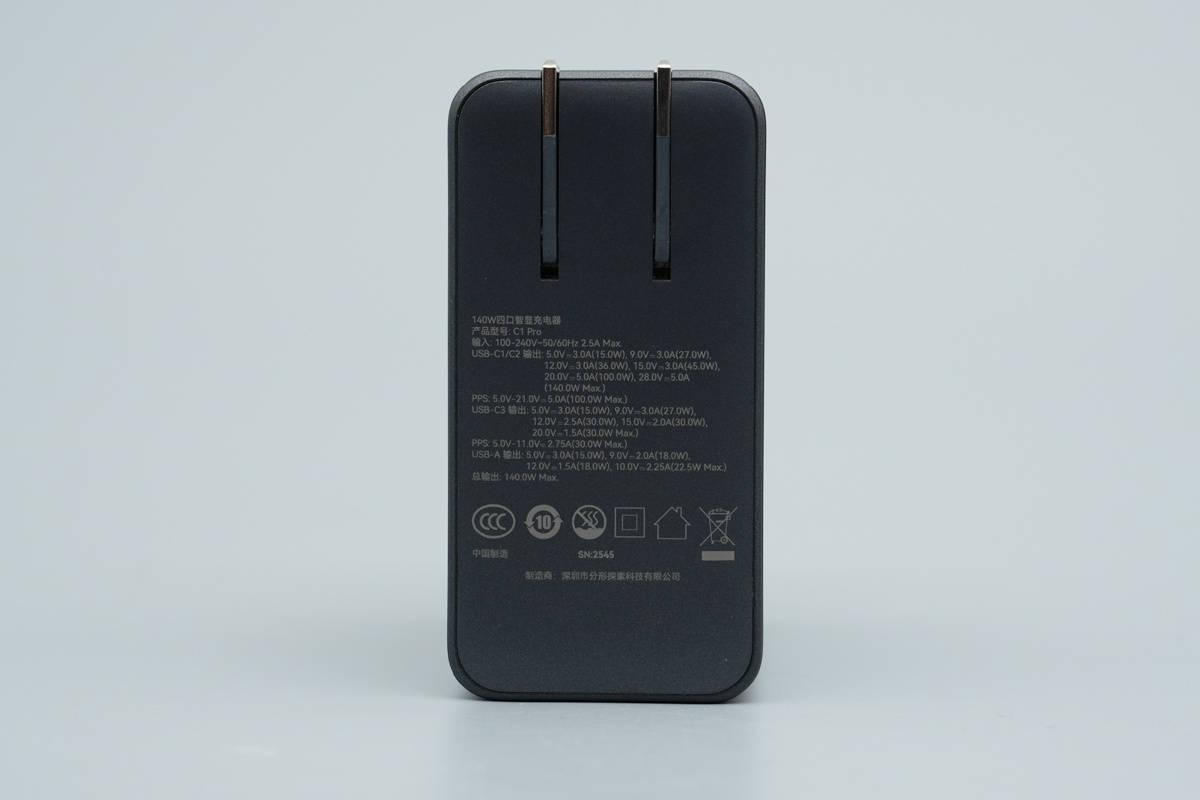 海赛力140W智显超级充电器C1 Pro采用PC阻燃材质塑料外壳,主体外壳表面喷漆处理,色调深邃质感不错。