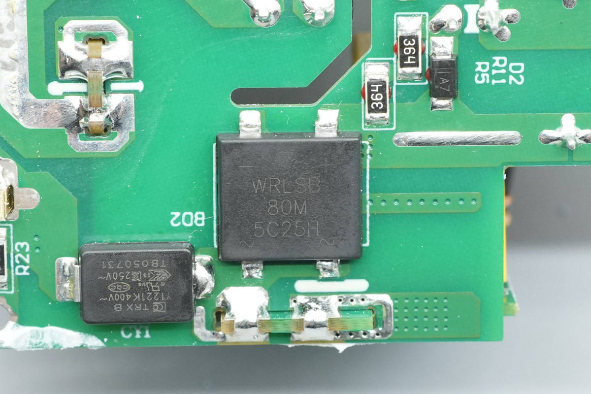 整流桥来自深圳市沃尔德实业有限公司,型号WRLSB80M,这颗软桥通过较软的恢复曲线,比较平滑的关断特性,可以降低二极管结电容达到非常少的谐波振荡产生的效果。选用的LSB封装,拥有良好的散热特性,帮助中大瓦数适配器提升可靠性,单颗可做60W+。