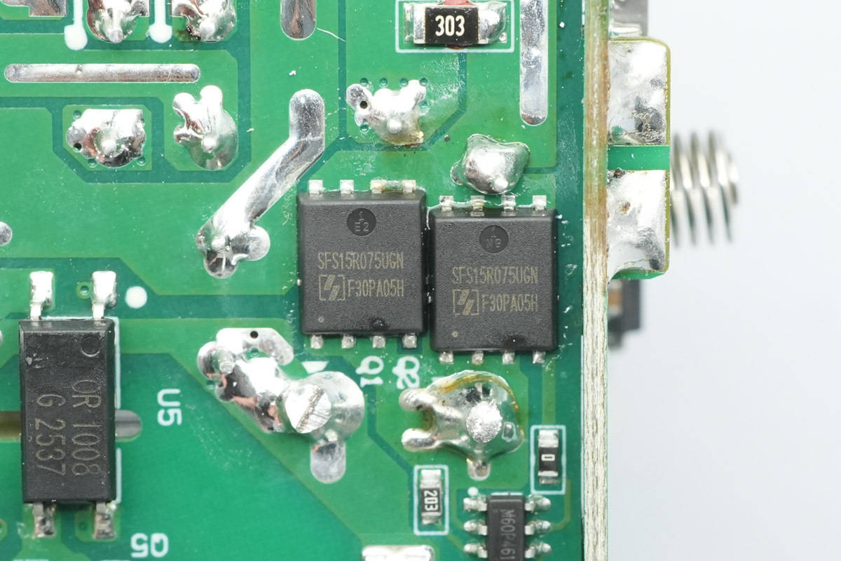 主板背面设有整流桥、初级主控『芯片』、初级开关管、同步整流控制器、同步整流管、光耦等器件。
