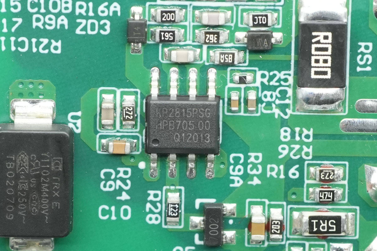 初级主控『芯片』来自必易微,型号为KP2815,这是一款原边反馈高PF反激式恒压控制器。『芯片』采用了准谐振、谷底开通的工作模式,效率高,EMC表现好。『芯片』集成高功率因数算法和THD补偿,全电压范围内满足PF>0.95及THD<10%,并且满足轻载分次谐波要求。