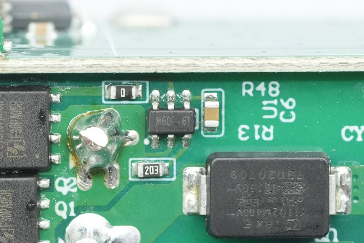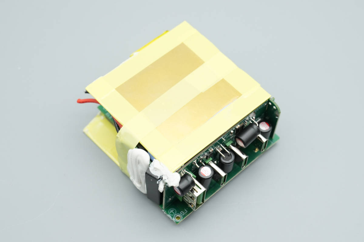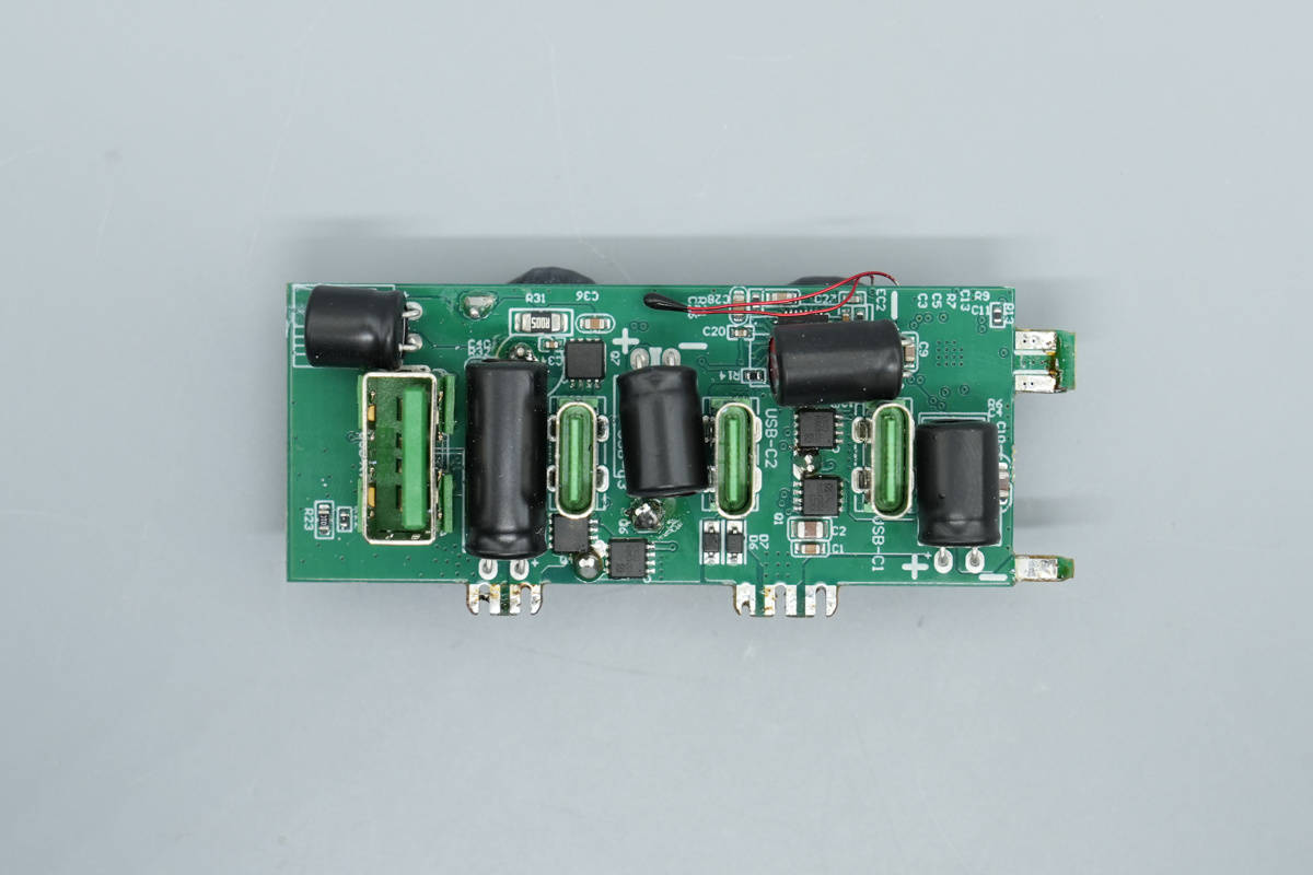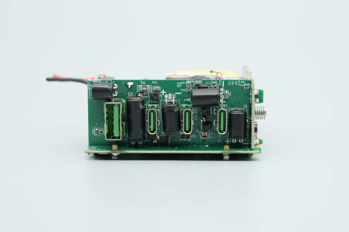 将小板拆下,板子正面设有降压协议『芯片』、同步降压开关管、VBUS开关管以及滤波固态电容,电容均做了绝缘处理。