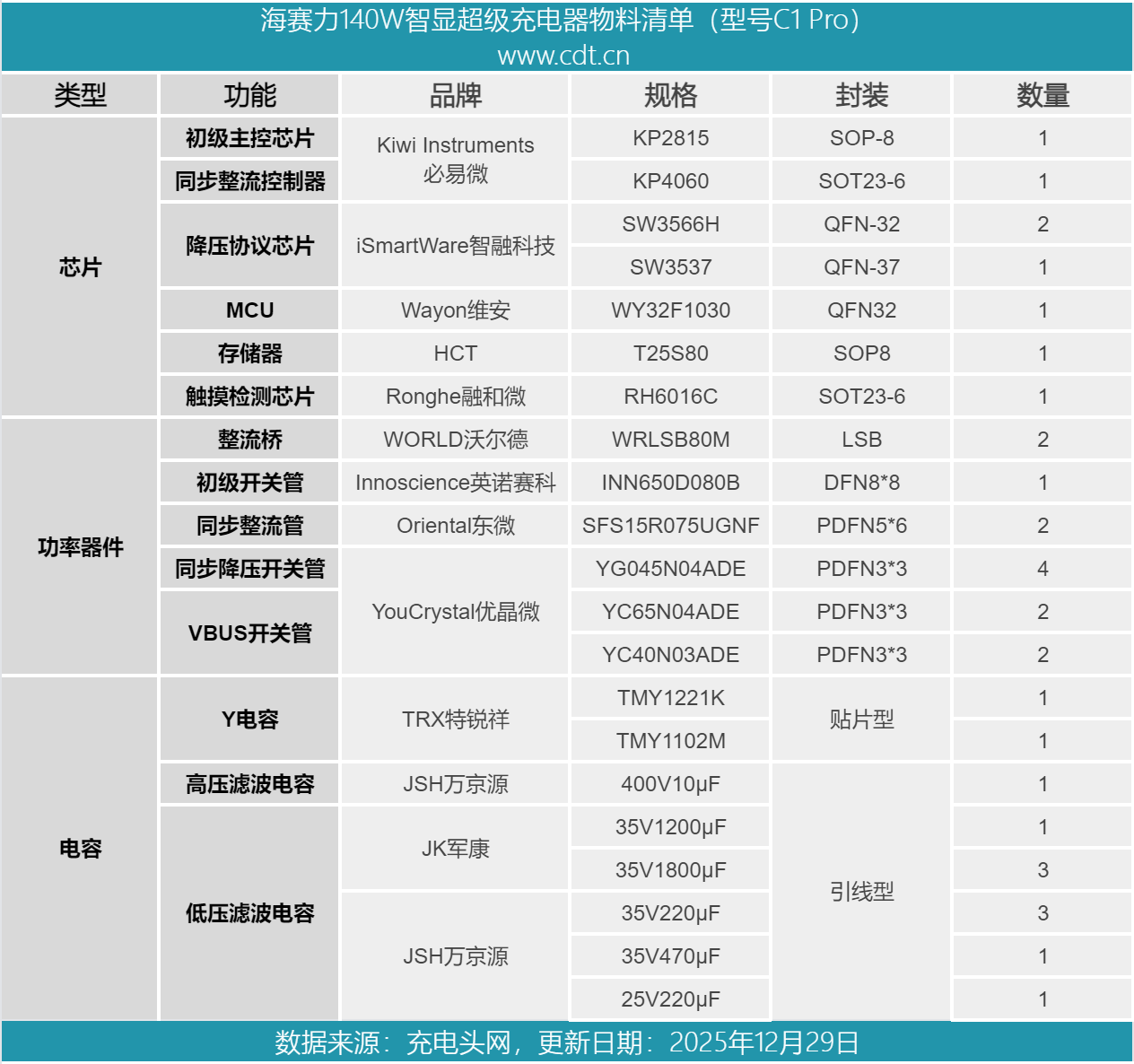 最后附上海赛力140W智显超级充电器的核心器件清单,方便大家查阅。