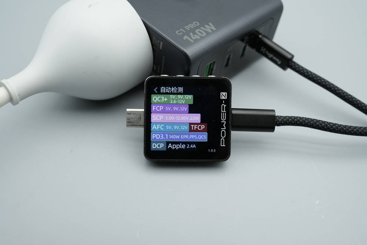 测得充电器USB-C1口支持QC3+/5、FCP、SCP、AFC、TFCP、PD3.1、PPS、DCP、Apple 2.4A充电协议。